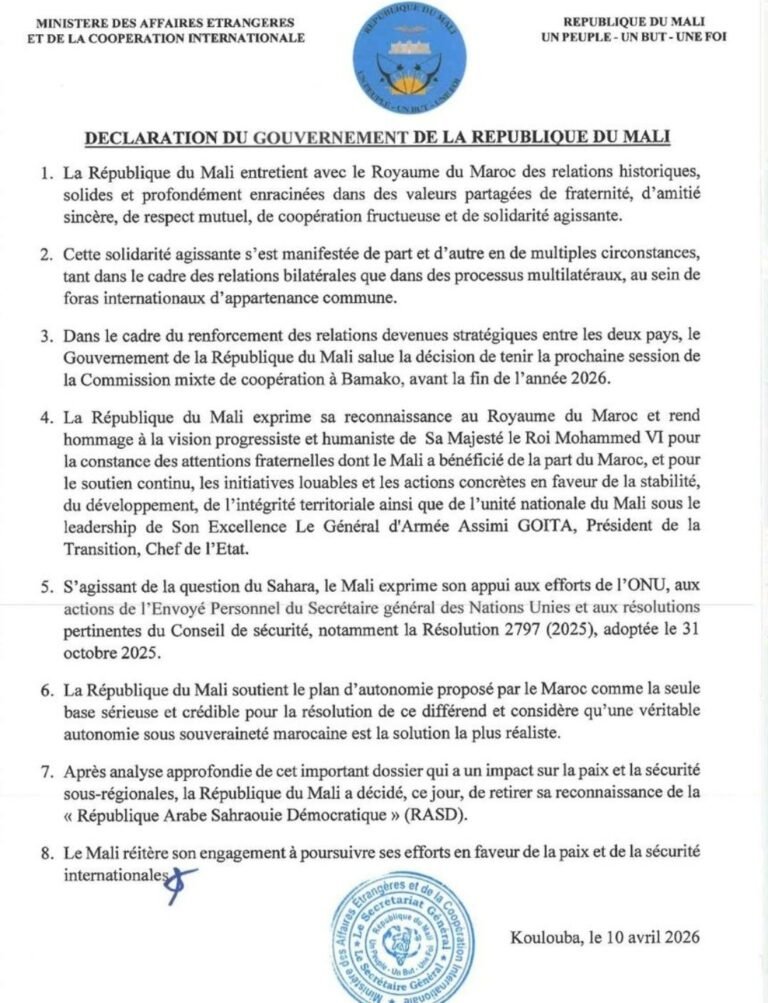 الرباط– ومع :”صدى البرلمان”//–أعلنت جمهورية مالي، يوم  10 أبريل، أنه « بعد تحليل عميق لهذا الملف الهام (الصحراء) الذي يؤثر على السلام والأمن الإقليميين، قررت جمهورية مالي، اليوم، سحب اعترافها بـ (الجمهورية العربية الصحراوية الديمقراطية).